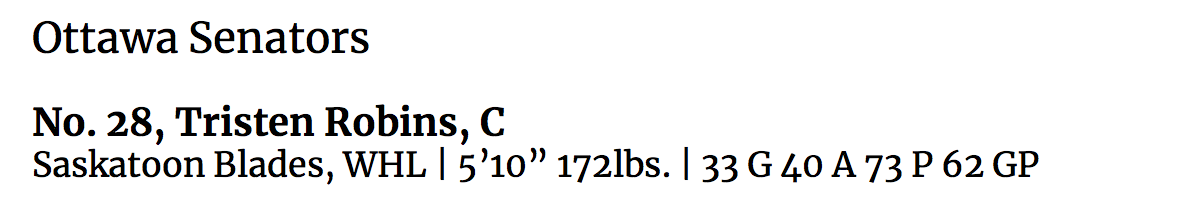 “A speedster in both ways….. quick, and talented….. one if the best skaters in this draft…. great hands, and offensive instincts….. buzzes around the ice….. quick release….. good playmaker as well…. can improve on defensive game, but coachable…. shows really good potential, and still developing.”
